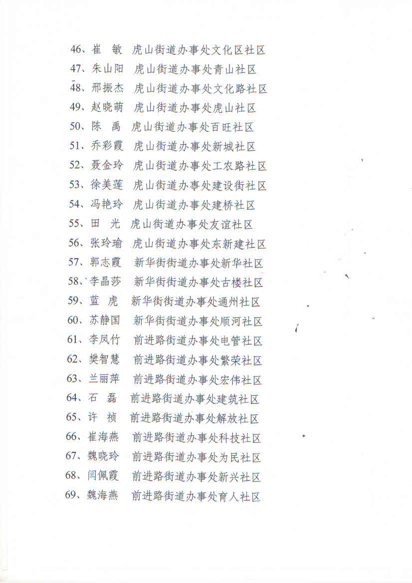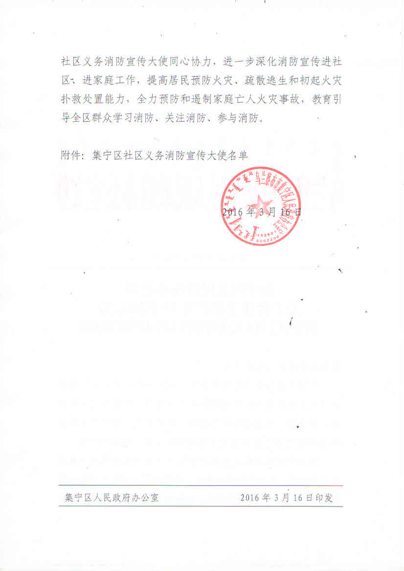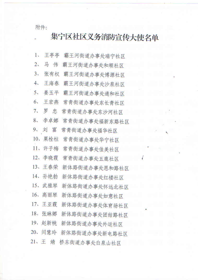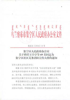 集宁区人民政府办公室关于聘任王亭亭等69名同志为集宁区社区义务消防宣传大使的通知