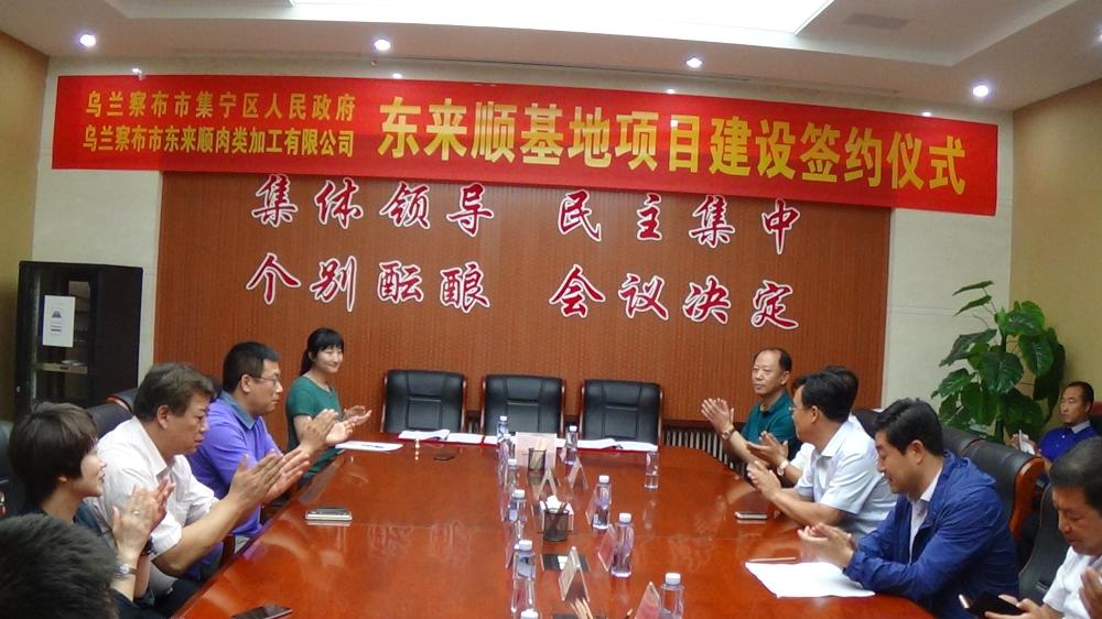 7月20日上午,乌兰察布市集宁区人民政府、乌兰察布市东来顺肉类加工有限公司基地新扩建项目建设签约仪式在集宁区政府3楼会议室举行。双方本着优势互补、共同发展的原则,就加快集宁区域内肉类市场的平稳快速规范发展等事项进行了约定,此次签约也是双方落实集宁区科学、健康发展的一项重要举措。