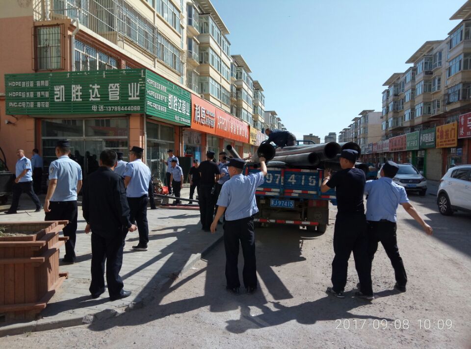 霸王河街道辖区内的神舟家园(神州建材城)为商住混合小区,商铺较多,人员流动性较大,环境卫生问题、占道经营、私搭乱建、乱堆乱放等问题较为突出,在“创城”工作中,街道社区及包联单位的工作人员投入了大量的人力物力进行集中整治,但仍有部分商铺存在侥幸心理,迟迟未按要求进行整改。9月8日上午,集宁区政府副区长、公安局局长白雁同志亲临神州建材城创城工作现场进行督导,对占用消防通道堆放大件建材的5家商铺给予严肃处理,清理占道管材、断桥、塑钢窗共计6车,并对商铺处以1万元罚款。白局长还以占道经营、乱堆乱放影响市容、危害公共安全为内容,对商铺进行了说服教育。最后,白局长指出:文明城市创建工作关乎每位市民,更需要大家共同维护创建成果,文明城市验收在即,各单位、部门都要加强整治力度,集中攻克重点难点问题,力争以优异的成绩迎接验收测评,并以更加亮丽的城市形象迎接党的十九大胜利召开。